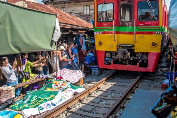Nos encontraremos no horário indicado no hotel Mode Sathorn, em Bangkok, e seguiremos 80 quilômetros a sudoeste da capital tailandesa. Nossa primeira parada será no vilarejo de Mae Klong, conhecido por um mercado muito especial: um mercado nos trilhos de um trem! Como veremos, essa é uma experiência muito curiosa. Quando a locomotiva se aproxima das barracas, os vendedores correm para retirar seus produtos das travessas do carril, colocando-os de volta no lugar assim que os vagões passam.